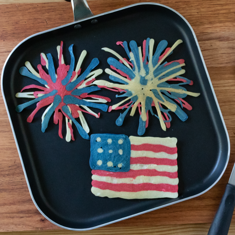 The art kit includes 2 silicone pancake molds, 1 four-cup batter mixer & dispenser, and 1 two-cup pancake art pen.